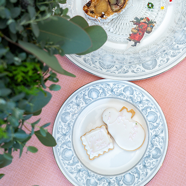 メインプレートにはクリスマスらしいデザートを2種。自家製米粉シュトレンは、小布施の栗の渋皮煮とラム酒に漬け込んだドライフルーツが入っています。ホワイトツリー型のフルーツケーキは、シュガーオーナメントを飾ってお楽しみください。
