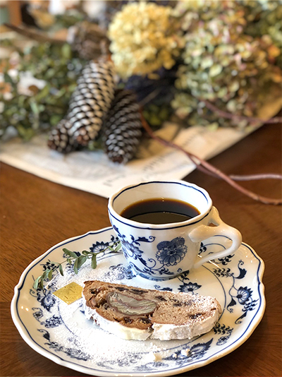 イートインでは特別に、シュトレンセットをご用意しました。シュトレン1切れとドリンク(コーヒーまたは紅茶)税込み1,400円のご提供となります。